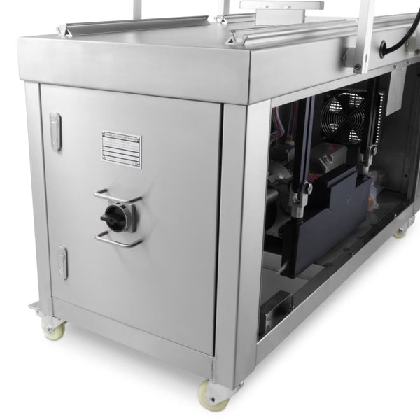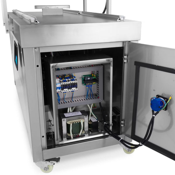 With a total of four 60 cm sealing bars (two per chamber), this machine can seal an impressive volume of bags in minimal time. Powered by two high-performance vacuum pumps (2 x 20 m³/h) and two powerful motors (2 x 750W), it guarantees speed and reliability. The all-stainless-steel frame rests on four wheels for easy movement, despite its weight of 278 kg. It is the ultimate industrial tool.